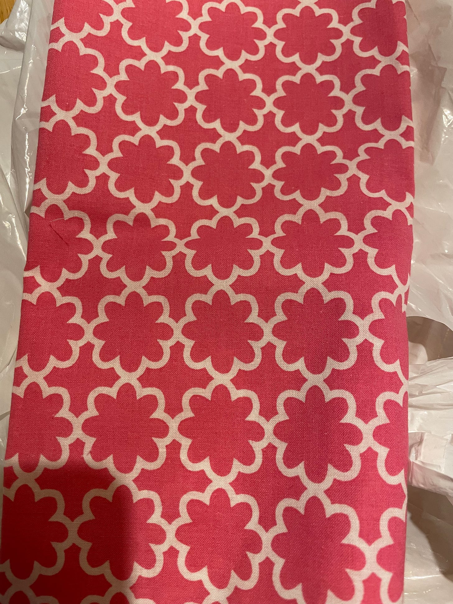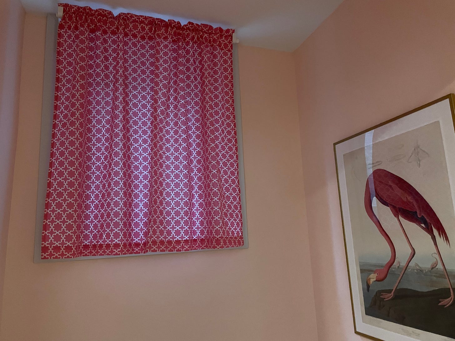Next, the powder room. This one was the actual privacy-requiring curtain, but also needed to let some light in. I was imagining something like a sheer-ish tulle, in fuchsia or I don’t know, didn’t want to go too sheer, but then the fabric store had something so much better.