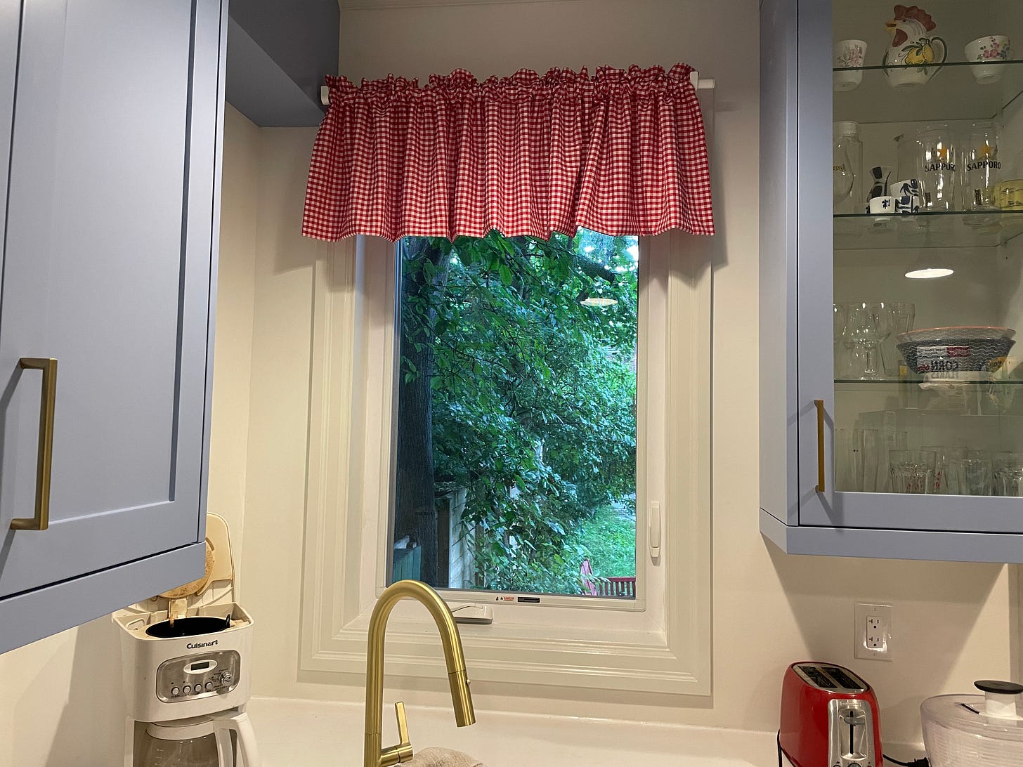 The kitchen one I wanted to be full-on storybook classic kitchen curtain. Not farmhouse-farmhouse with actual chickens printed on it, but red-and-white gingham. Does this make the kitchen a little red-white-and-blue? Maybe! Is the material itself a bit boring, relative to what’s in the powder room? Could be! But I think it works. It’s at any rate what I was picturing. And the dry cleaner went above-and-beyond with how it’s all sewn together, such that it is far better than the sort of flap of material I was picturing.
