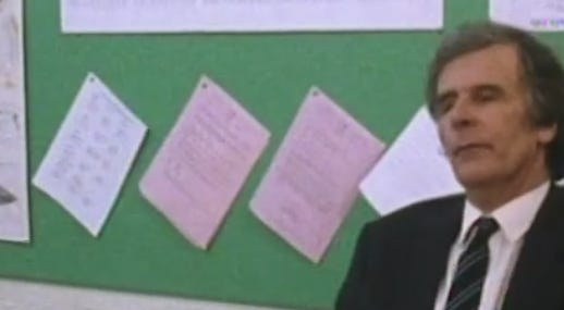 Drugs are, however, the theme of the “Hetty Wainthropp Investigates” episode, “Childsplay” (1998). Drugs-drugs, no mere cannabis this. The show has an occasional tendency to dip into afterschool special mode, and here it does so with a vengeance. The plot: Hetty has a relative, an early-adolescent boy named Tom. Tom has just started at a new school, where he is bullied for having moved from the south of England, which is apparently the crime of the century, and Hetty is brought in to sort this out. There’s even a gym teacher who, with a tinge of homophobia, taunts the boy for being from the soft south. Like I said I have no idea. Bournemouth is where “Waiting for God” is set, whereas some other shows are set in the north, I generally but clearly not always like the north-type ones more, but as for the non-television aspect of this I cannot say.
